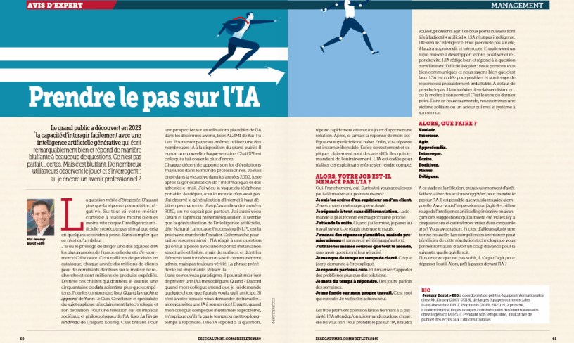 Article publié en octobre 2023 dans le numéro de 149 de ESSEC Reflets Magazine. Il sert d’inspiration et d’improvisation à l’ouvrage du même nom : Prendre le pas sur l’IA.